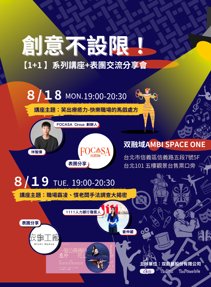 表演團隊: FOCASA 馬戲團以輕鬆幽默的馬戲視角,分享如何在職場中注入歡笑與創意,為忙碌的工作日常注入療癒能量。
